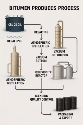 . bituumen tootmisprotsessi muudab toornafta tugevaks sideaineks teede, katuste ja veekindlate materjalide jaoks. Iga etapp toimub range kuumuse ja rõhu kontrolli all, et tagada lõpptoote stabiilsus ja ohutus.